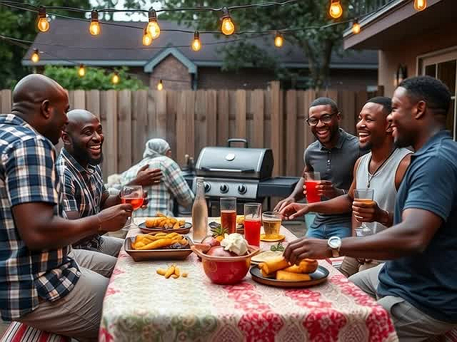 This scene depicts a group of Black men gathered around a table in a relaxed outdoor setting, enjoying a meal together. Here are several elements that visually convey community and social bonding: